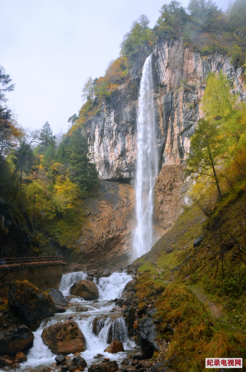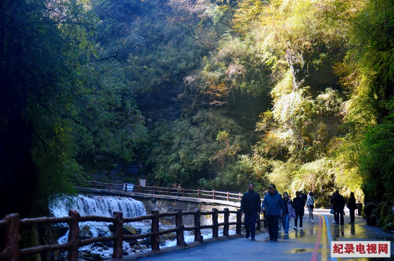 峡谷步道旁,溪流奔腾咆哮,在岩石间激起雪白的浪涛,岸边金黄的树叶随流水的韵律翩然落下。瀑布从陡峭崖壁飞泻而下,水雾弥漫在空气中,带着秋的微凉扑面而来,恍惚间,似与仙境撞了个满怀。