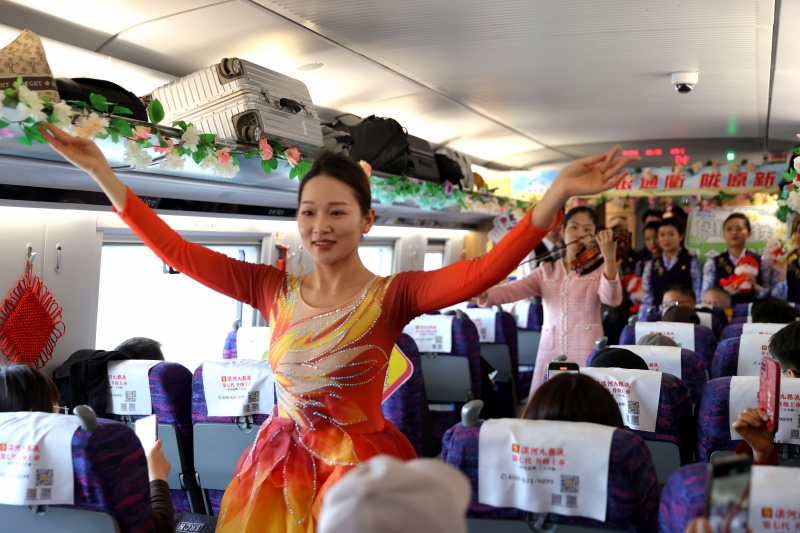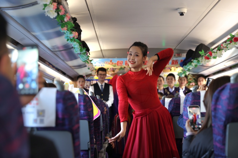 车厢里,列车庆祝活动正在旅客的欢呼与阵阵掌声中火热进行中。兰州客运段的主持人首先介绍了包银高铁建设和开通情况,随后,身着高铁制服的乘务员们率先登场,带来礼仪操与说唱相结合的特色节目《礼韵节拍》,精心编排的服务礼仪展示既彰显了高铁乘务员专业规范的职业素养,又传递出优雅亲切的服务形象。吉他弹唱搭配手鼓伴奏的《乌兰巴托的夜》缓缓响起,悠扬旋律在车厢里萦绕;小提琴独奏《我和我的祖国》配上灵动伴舞,深情旋律引发全场共鸣;舞蹈串烧《民族大联欢》则以浓郁的民族风情点燃现场,将气氛推向高潮。优美的舞蹈与动听的歌声交相辉映,引得观众连连叫好。