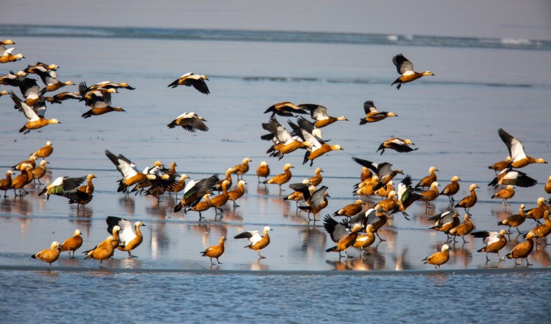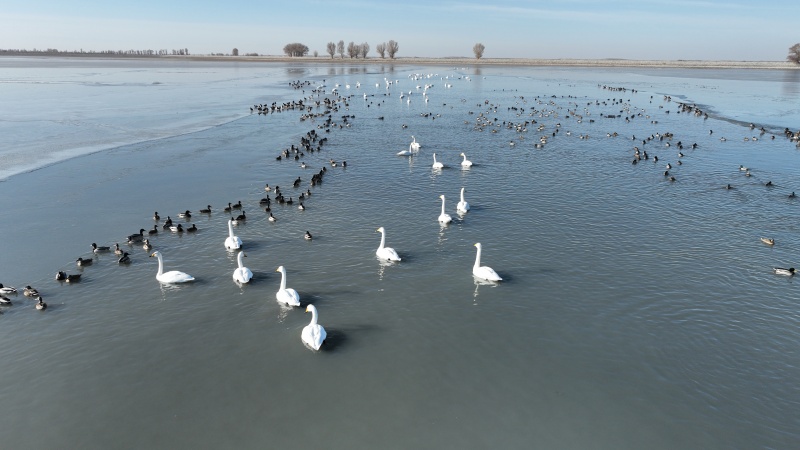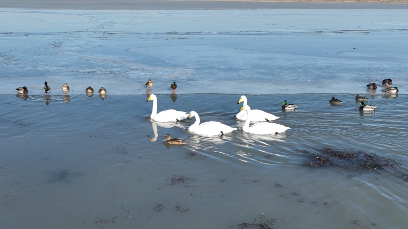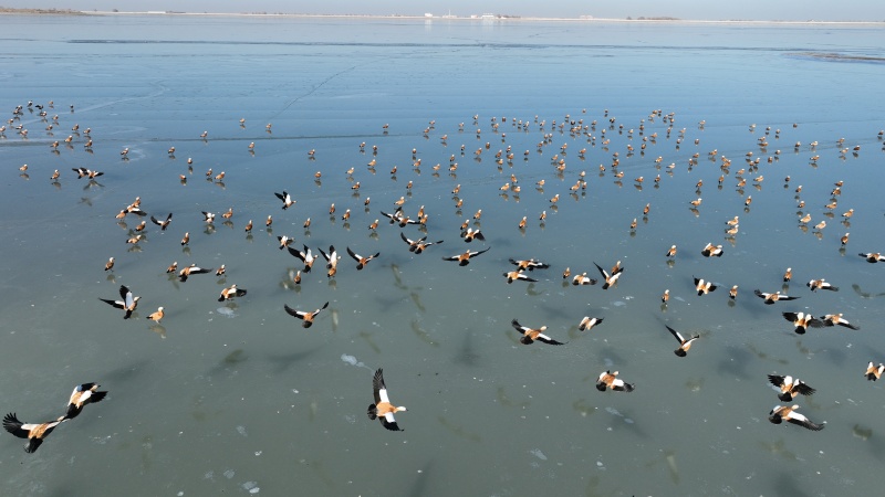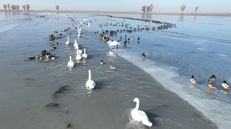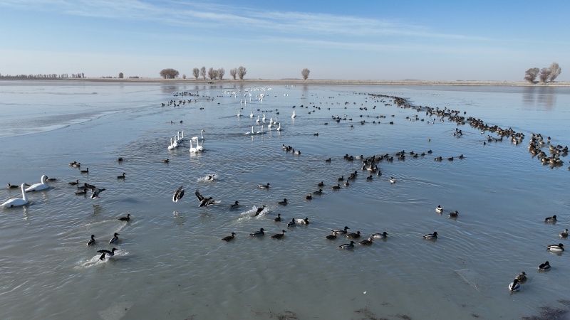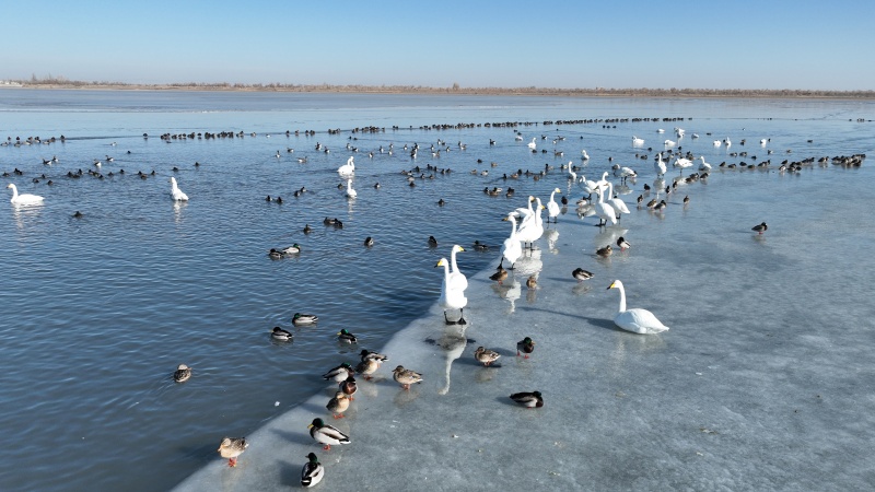 监测数据勾勒出金塔湿地的生态“成绩单”:越冬种群中,既有白尾海雕、黑鹳等国家一级保护动物的珍稀身影,也有大天鹅、白鹭等国家二级保护动物翩翩起舞,绿头鸭、赤麻鸭更是集群而来,形成铺天盖地的“鸟浪”。珍稀鸟类的集中亮相,成为金塔生态环境持续向好的最直观见证。