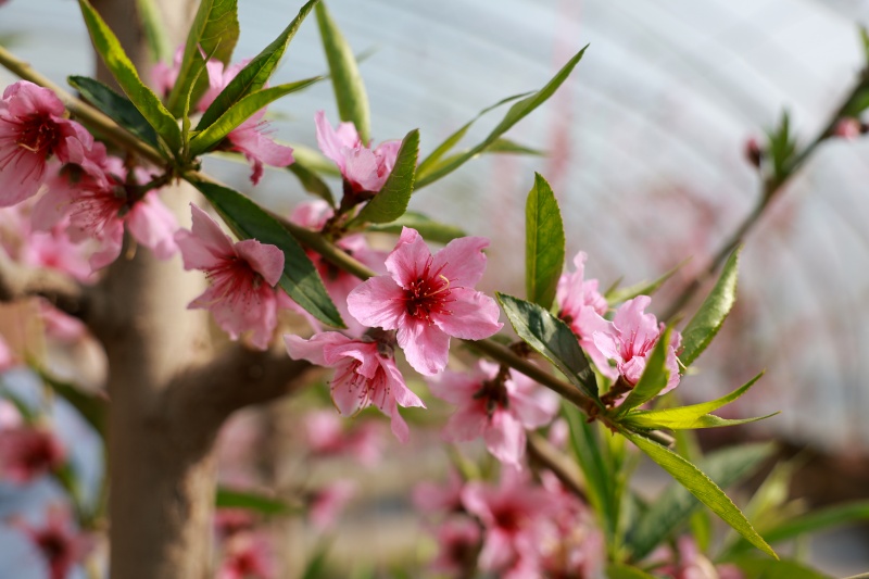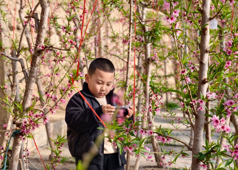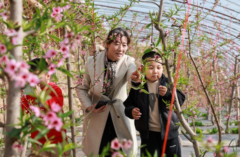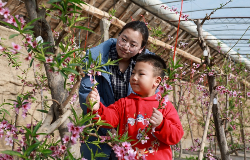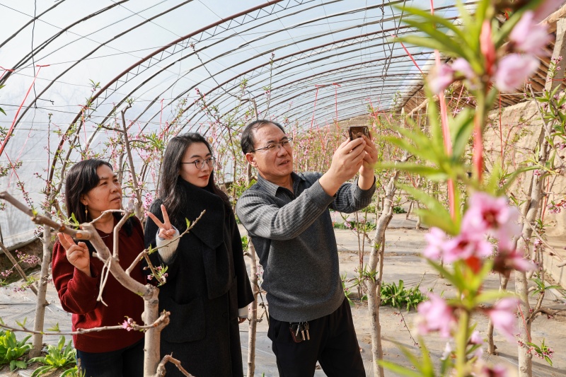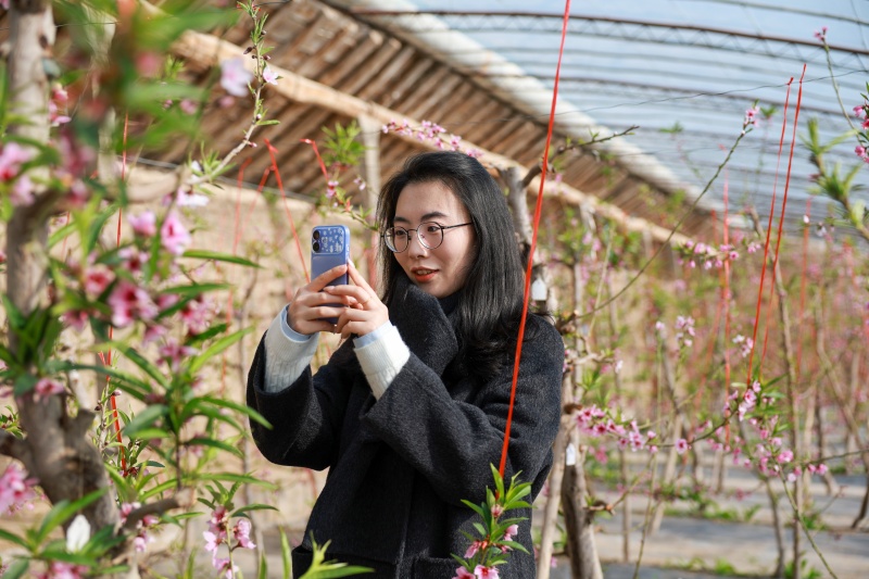 本网金塔讯(曹红祖 侯亚楠 摄影报道)2月4日,甘肃省酒泉市金塔县金塔镇金大村的温室大棚内暖意融融,朵朵桃花竞相怒放,吸引了众多游客前来驻足观赏、拍照打卡,感受浓浓春意。